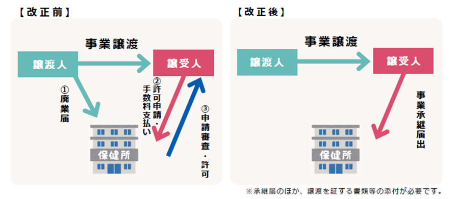 生活衛生関係営業等の事業活動の継続に資する環境の整備を図るための旅館業法等の一部を改正する法律が令和5年6月14日に公布され、食品衛生法の一部が改正されました。令和5年12月13日の施行に伴い、事業譲渡に関する手続が整備され、営業の譲渡があった場合には、譲受人は新たな許可の取得等を行うことなく、届出により営業者の地位の承継が可能となりました。